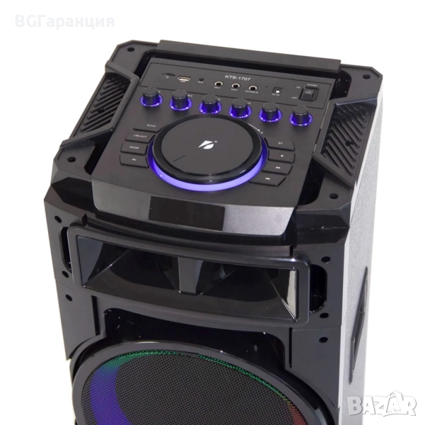 В комплекта са включени безжичен микрофон и дистанционно управление, което позволява лесен контрол от разстояние. Панелът за управление включва настройки за сила на звука, баси, високи честоти, ехо ефект и контрол на микрофона, което дава гъвкавост и удобство при различни сценарии на използване.