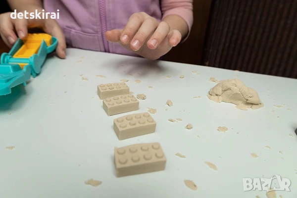 Кинетичният пясък, включен в комплекта, е мек и гъвкав. След игра, просто го приберете в контейнера му, за да запази свойствата си за дълго време.