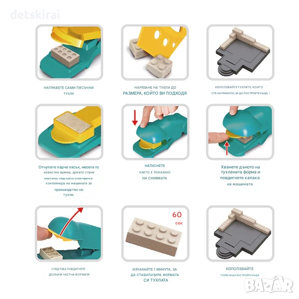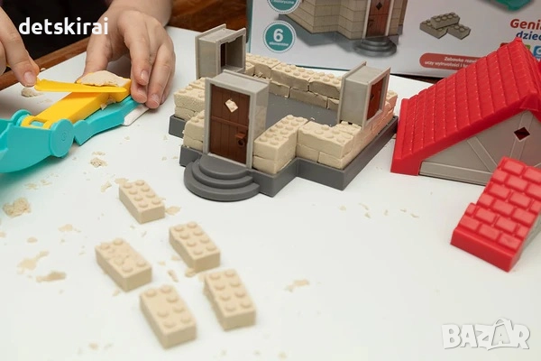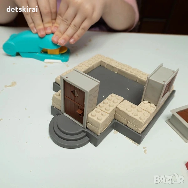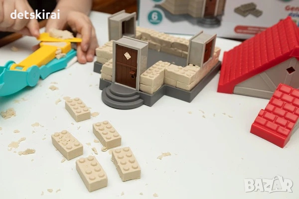 Комплектът включва машина за тухли, мистрия, щипки, елементи за изграждане на къща като прозорци, врати, под и 750 г кинетичен пясък – всичко необходимо, за да създадете свои собствени миниатюрни четири стени!