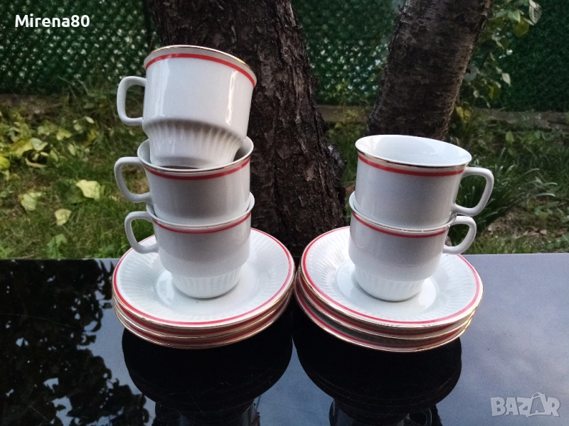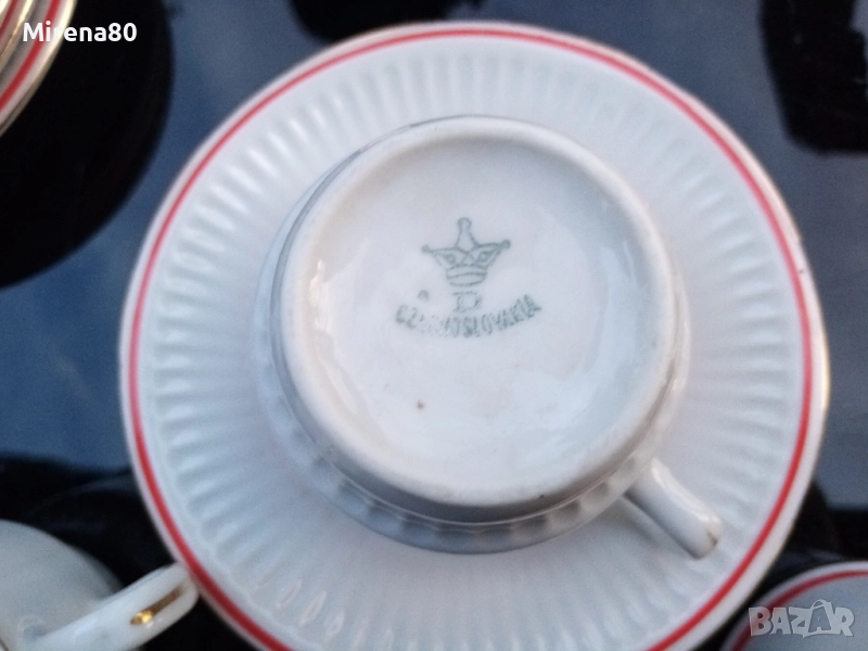 Едно непълно сервизче (1 чаша липсва) от Чехословакия - производство втората половина на миналия век. Много стилни и елегантни - фин бял порцелан с оранжево-червен кант и позлата. Формата е много удобна, могат да се стиковат една върху друга и заемат малко място. Вмест. 100-120 мл, чинийките са 13 см. Отлично състояние !