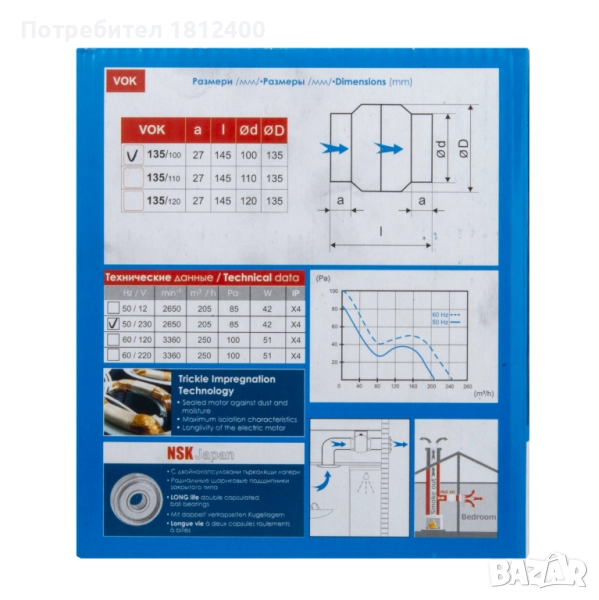 Канален вентилатор ВОК 135/120: 205 куб/м на час.