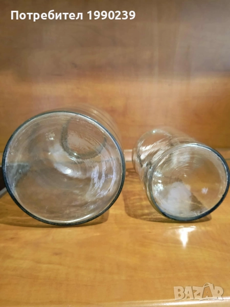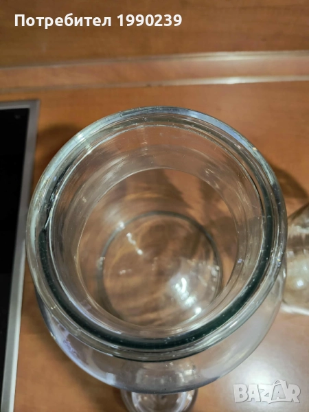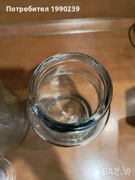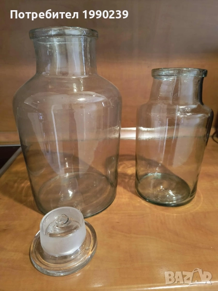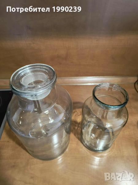 Стъклени буркан с вместимост 2,5 литра. Подходящ за съхранение на различни продукти, напитки или други домакински нужди. Изработен от качествено стъкло, с добра плътност и здравина. Няма пукнатини или наранявания по гърлото. Височина - на малкия – 26,5 см.; диаметърът на отвора – на малкия – 8,5 см. .Големият буркан е продаден.