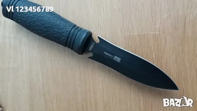 Интересен дизайн. Дръжката е гумирана и оребрена, което спомага за добрия захват при употреба. Острието на камата е отлично двустранно сведено и заточено. В края на дръжката е предвиден шип за чупене на стъкла. Ножът може да се ползва като допълнение към екипировката при риболов, лов, туризъм, къмпингуване и др. Снабден е с много здрава полимерна кания с възможност за лесно и бързо поставяне и смъкване от колана. Двата отвора в долния край на канията отвеждат водата и предпазват ножа.