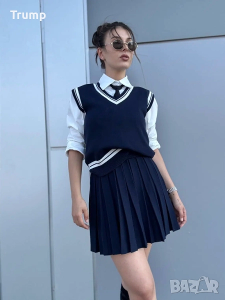 Шик комплект , Академи, пресирана пола , риза , елек, вратовръзка, цвят тъмно син → Обява 52285502