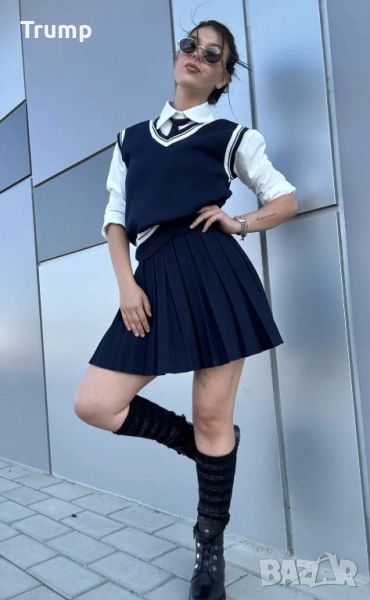 Този комплект съчетава модерна визия с бунтарски акцент. Плисираната пола и елекът напомнят за класическия училищен стил, докато бялата риза внася свежест и контраст. Черните детайли – вратовръзката и допълнителни акценти – добавят сила и характер, превръщайки визията в балансирана комбинация от елегантност и уличен дух.