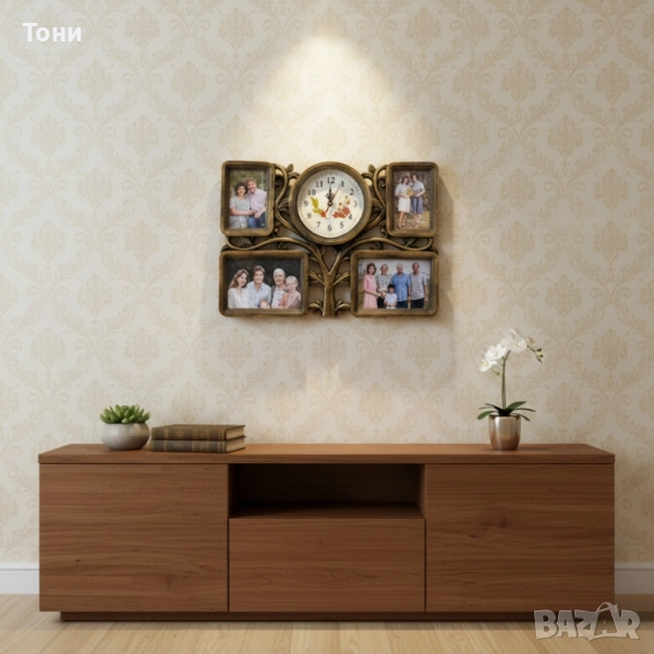 Ако снимките ти са разпръснати из чекмеджетата, а стената няма характер, тази фоторамка с часовник (47×34 см) решава всичко. В дървовиден дизайн с четири рамки и централен аналогов часовник съхранява спомените ти и ти показва времето. Предлага се в изискано бяло и топъл бронз, за да подхожда на всеки интериор. Изработена от здрава пластмаса, лесна за монтаж и поддръжка. С компактни размери, но впечатляващо присъствие, създава уют у дома, в офиса или като личен подарък. Всяка рамка побира стандартна снимка и предпазва от прах. Рамките са със стъклени панели, а часовникът работи тихо с една AA батерия. Няма нужда от множество рамки и отделен часовник – всичко е тук, подредено красиво и функционално.