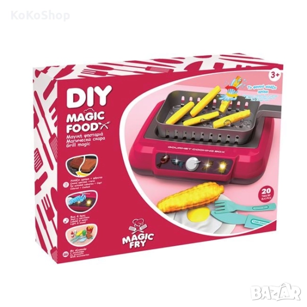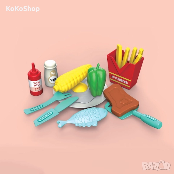 Комплекта съдържа 6 различни храни, които променят цвета си при "готвене". Комплектът включва и кошничка за пържене, чиния, шпатула, вилица, нож, солничка, контейнер за картофи, бутилка кетчуп и стикери.