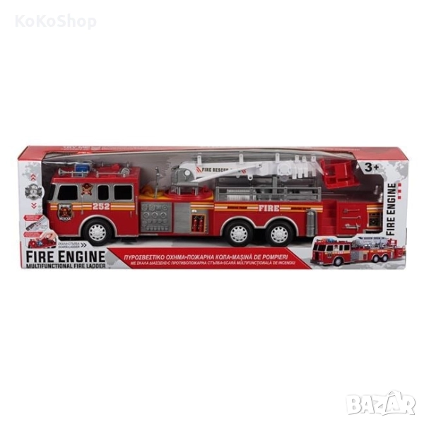 Реалистична детска пожарна кола,която е дълга цели 60 см. Пожарната е снабдена с телескопична стълба,кош за спасяване на хора и сирена с автентични звуци и светлини.