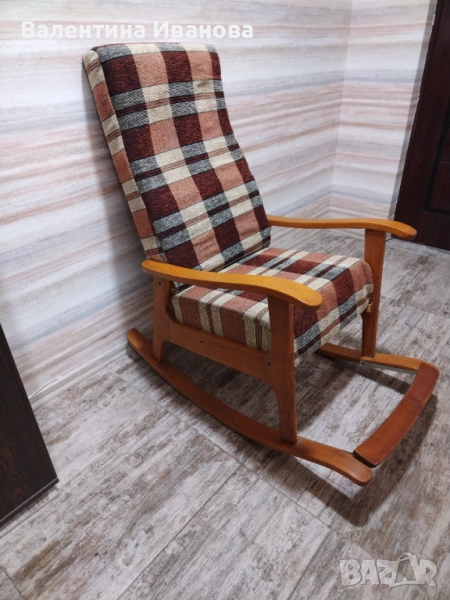 Люлеещ се стол дървен, масивен. Със нова дамска и дунапрен. Два броя, цената е за един.