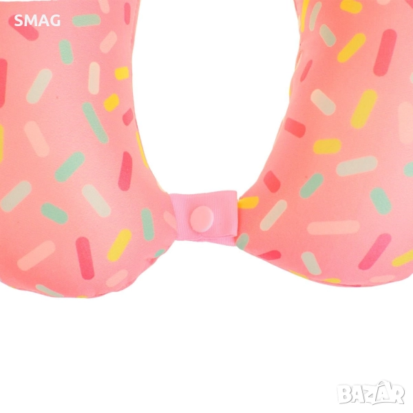 Очарователна и удобна възглавница за пътуване в розов цвят с ефектна шарка и цветни конфети. Лека и мека, осигурява комфорт по време на дълги пътувания със самолет, кола или автобус. Идеален избор за хора, които ценят стила и удобството по време на път.