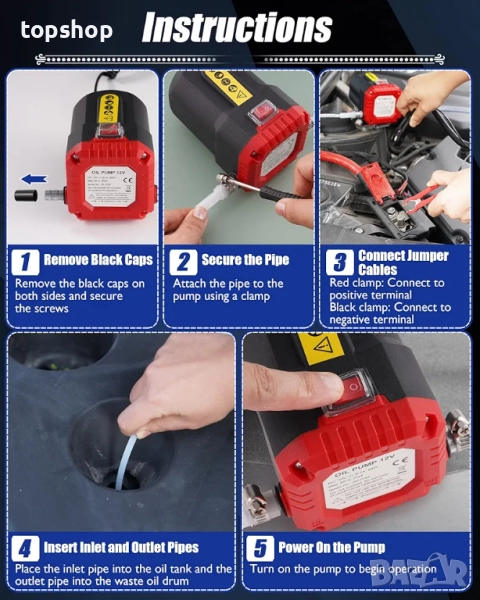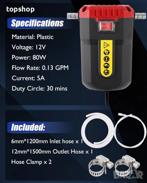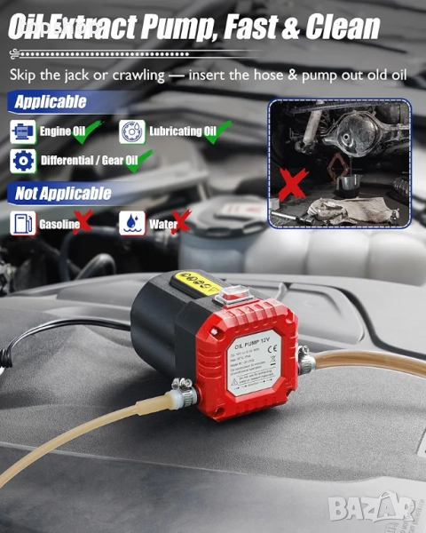 Кратки спецификации: 12V DC | 80W мотор | Изпомпва до 0,5 л/мин моторно масло.