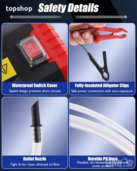 Подобрена защита от свръхток: Тази 12V помпа за извличане на масло е с подобрени възможности за поток и защита от свръхток, като се изключва при откриване на чужди предмети. С меден мотор за бързо и стабилно засмукване, тя осигурява ефективно изсмукване.