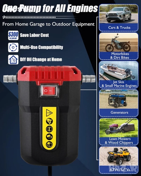 Работи със смазочно масло: Тази електрическа помпа за смяна на масло работи с моторно масло, трансмисионно масло, ATF и смазочно масло - чудесно за автомобили, мотоциклети, косачки за трева, водоструйки, лодки и джетове.