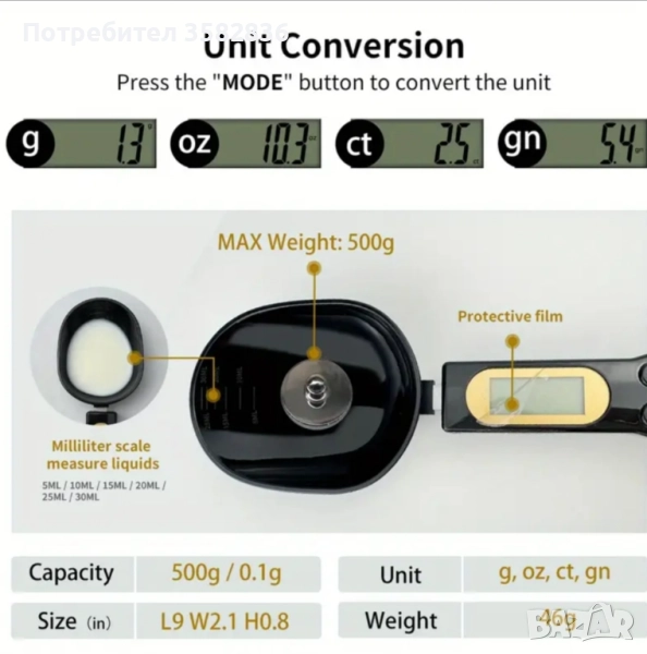 Измервателен диапазон: до 500 g (с висока точност ±0.1 g)