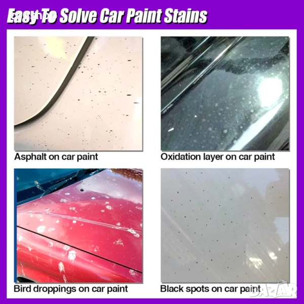 ★ МОЩНИ ФУНКЦИИ --- Може да премахва различни видове болтове, като ръжда, мазнини, замърсявания от мъртви насекоми и прекомерно пръскане и др. Може да се използва в много части от каросерията на автомобила, като например огледална повърхност, броня и други.
