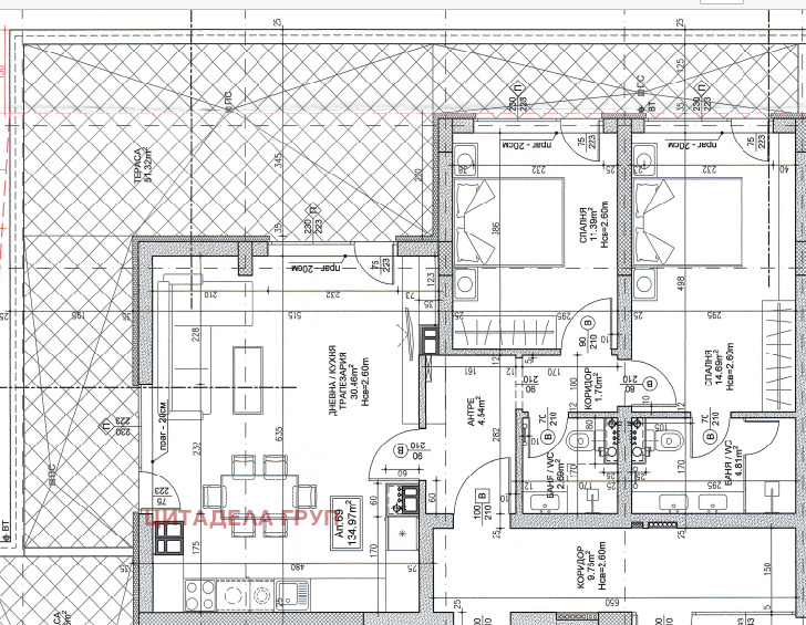 Входно антре, всекидневна с кухненски бокс, две спални, баня с тоалетна, отделна тоалетна и голяма тераса в размер на 51м2.