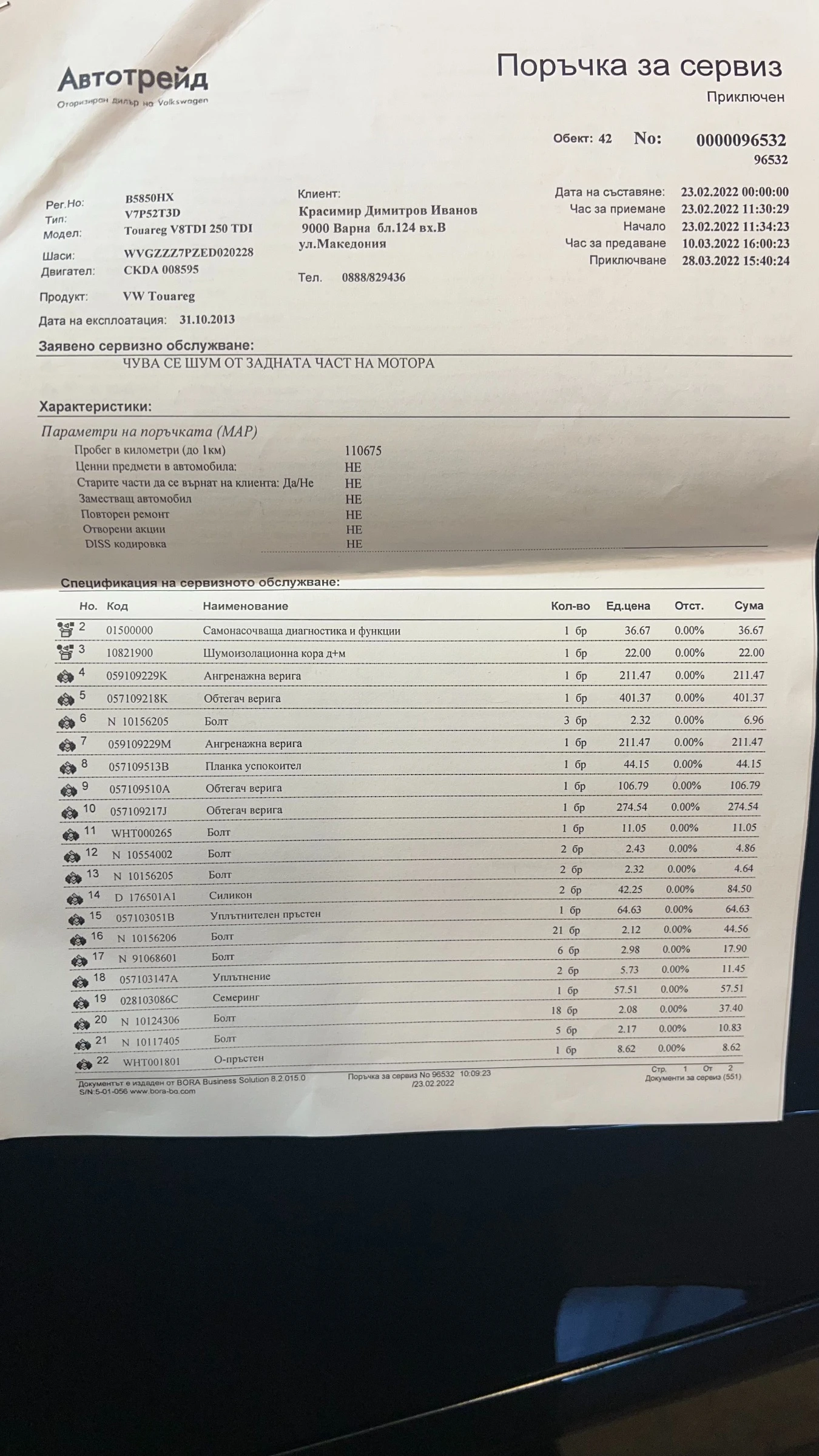 Автомобилът е Touareg X, закупен от автотрейд на 111000км, втори сибственик. В момента е на 160000км. Сменени верига и всички консумативи в автотрейд. Сменено масло на скоростната кутия. Автомобилът е изключително запазен и поддържан. Платено автокаско до 30 Януари.