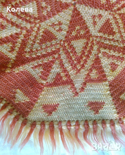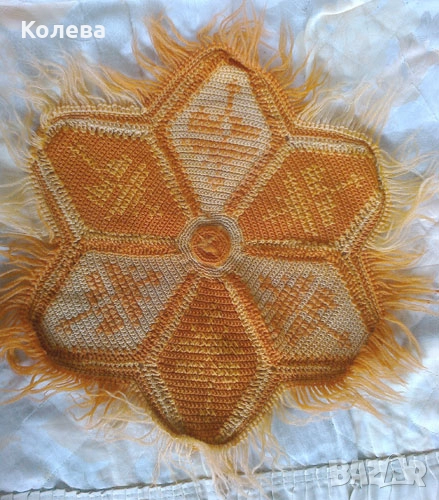 -- Четири декоративни вълнени възглавки от средата на миналия век или от по-рано. Две по две еднакви, плетени, за столове. Оранжевите са във формата на цвете, а червените – като осмоъгълник. Много интересно и бавно за изработка е. Окрайчването им е с пискюлчета от преждата. От прането цветната боя е пуснала и е оцветила бялата. Но това стои не като дефект, а като търсен ефект. Не пречи на ползването, защото е равномерно. Ако им се зашият подходящи гърбове – могат и да се напълнят. Цена 20 лв / 10, 22 евро Посочената цена е за всички. Състояние - много добро. Не са проядени от молци.