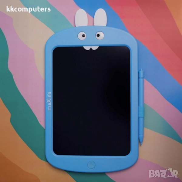 Цветен LCD таблет за рисуване MXWB-02 Maxlife е проектиран специално за деца. Таблета е не само практичен, но и има интересен дизайн. В горната част има ушите и очите на заек, които се движат, добавяйки весел и интерактивен елемент. Комплектът включва и безопасен химикал, който позволява лесно и прецизно писане и рисуване по таблета.