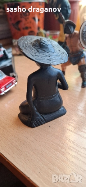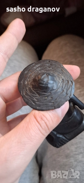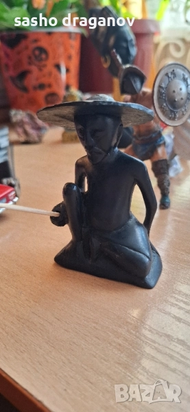 Ръчно изработена дървена фигурка, която изобразява човешка фигура. Фигурката е с тъмен цвят и носи широкопола шапка. Тя е в добро състояние, въпреки някои признаци на употреба. Интересен декоративен предмет, който може да допълни интериора ви.