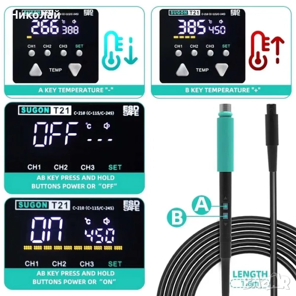 Станция за прецизно запояване Sugon T21 (държач с бутони за регулиране, стандарт JBC 115, 3 канала памет, 120W, 100C - 450C).
