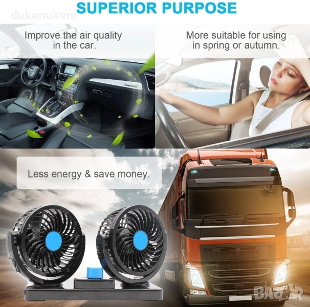 Двоен вентилатор – 2 въртящи се глави за максимално охлаждане на водача и пътниците.