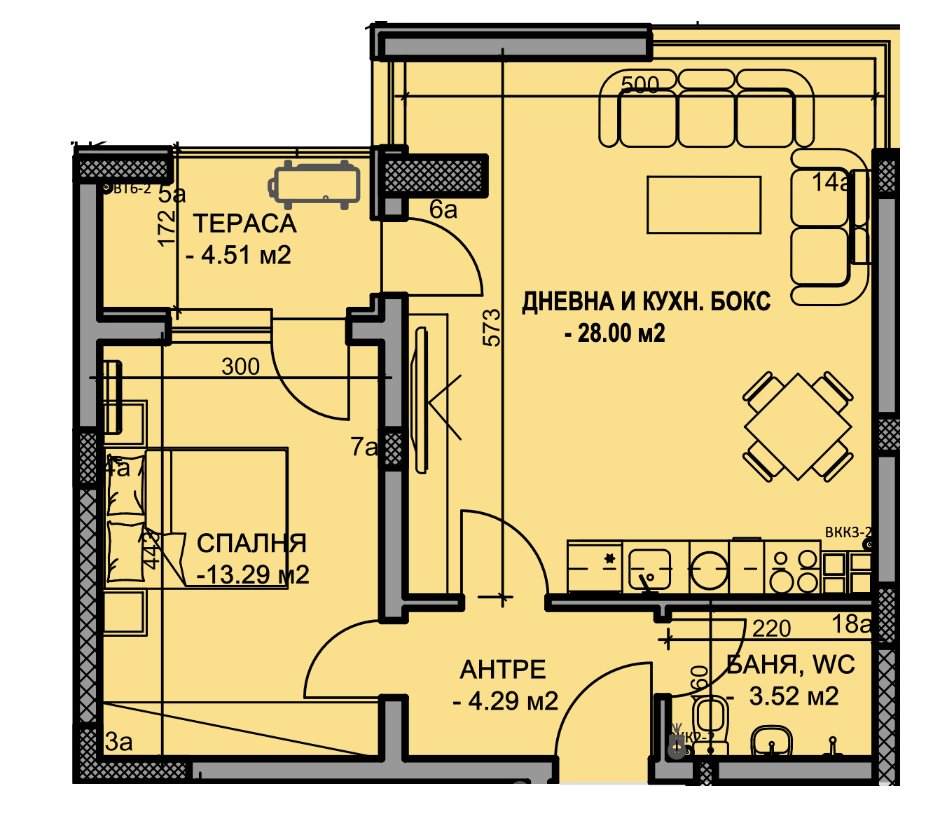 ➡Апартаментът се състои от антре, баня с тоалетна, спалня, дневна с кухня и трапезария, тераса и е с обща площ от 76,45 кв.м.