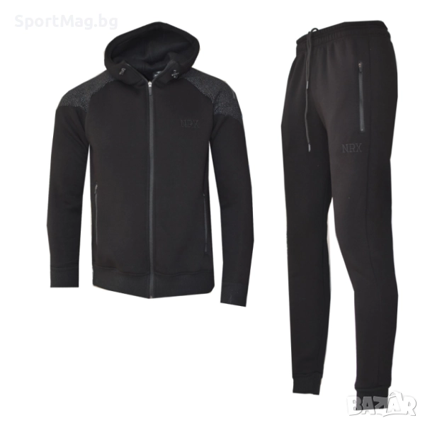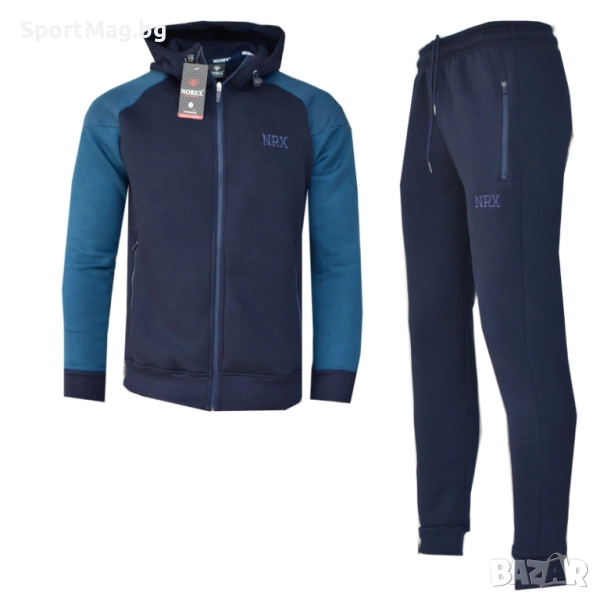 - Модерен Двуцветен Дизайн: Суитшъртът е с **качулка и цип** по цялата дължина, изпълнен в **елегантно тъмносиньо** с **контрастни сини ръкави** (тип реглан). Кройката е с **нормален крачол**, а дискретното лого **NRX** на гърдите и крачола придава завършен спортен вид. Идеален е както за **спорт** и **фитнес**, така и за **свободно време**.