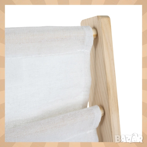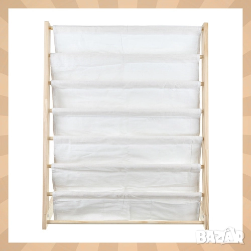 Създай подреден и уютен детски кът с тази практична и безопасна детска библиотека. Етажерката е с височина, съобразена с ръста на децата, което им позволява самостоятелно да достигат до любимите си книжки и да развиват навика за ред и четене. Комбинацията от дървена рамка и текстилни рафтове придава лекота, стабилност и естетичен вид, подходящ за всеки интериор – от скандинавски до класически стил.