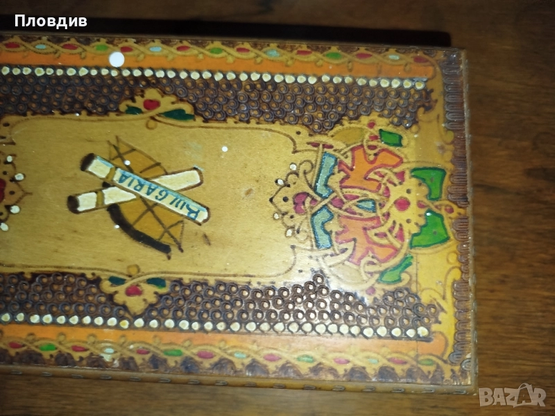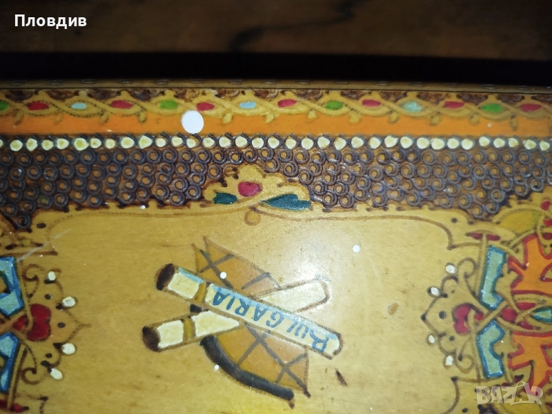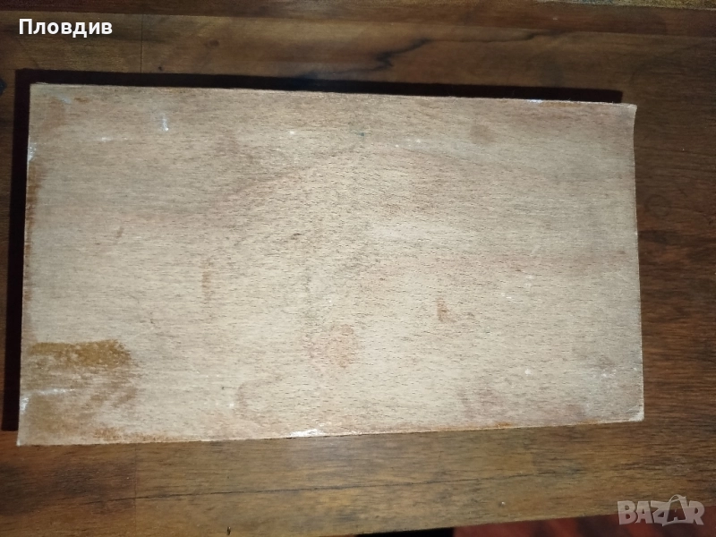 Стара дървена кутия. В добро състояние. Има 3-4 точки от боя на капака ( белите ) и дъното леко в края се е разлепило. Цената е съобразена.