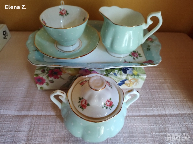1) Комплект латиера и захарничка с две дръжки и капаче от серията Polka Rose, оригинално от 1930-те, а сега пресъздадена отново през 2007 год. Серията е с млечно зелен цвят на нежни бели точици и единични розички, отвътре и отвън, и с характерната за марката дръжка.същата млечно зелена серия Polka rose. Те са с класическата винтидж форма на Royal Albert. Захарничката е в много добро състояние, със съвсем леки износвания или разнасяние тук таме по канта. Латиерата е с по-захабени кантове и има повече следи от ползване. Това е отразено в цената и. Размерът на латиерата е височина 10.5см, широчина 12см, 280мл обем. Размерът на захарничката е височина 10.5см с капачето, широчина 14.5см. Цената на комплекта е 40 лв (20.45 евро).