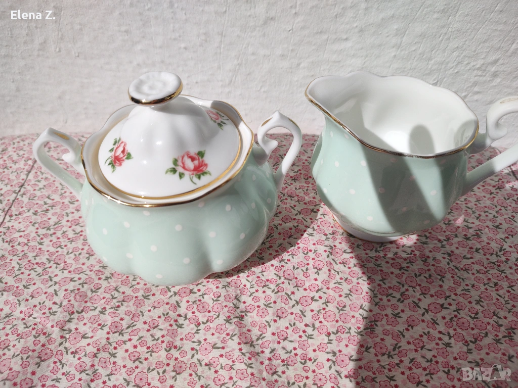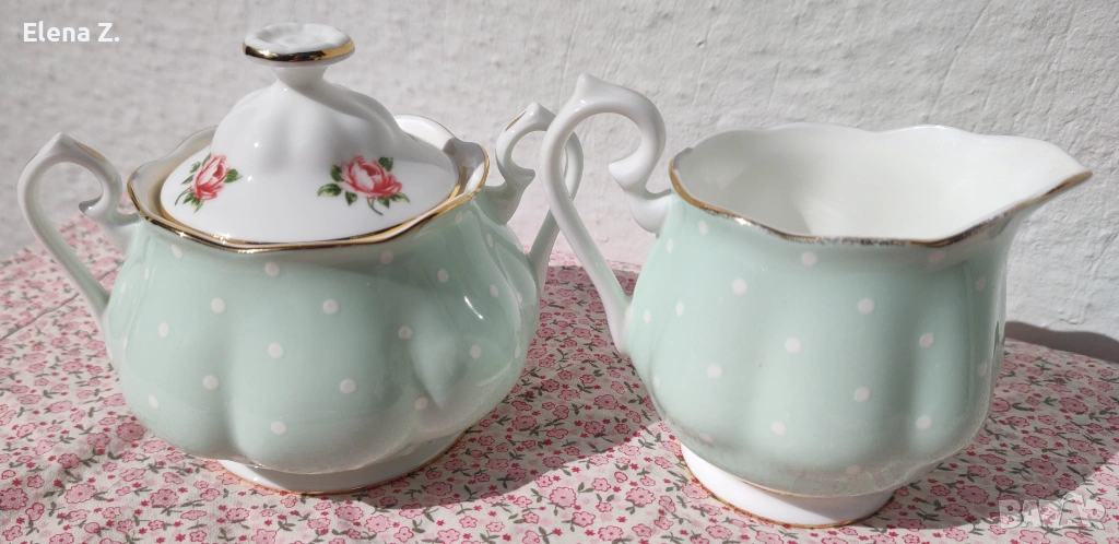1) Комплект латиера и захарничка с две дръжки и капаче от серията Polka Rose, оригинално от 1930-те, а сега пресъздадена отново през 2007 год. Серията е с млечно зелен цвят на нежни бели точици и единични розички, отвътре и отвън, и с характерната за марката дръжка.същата млечно зелена серия Polka rose. Те са с класическата винтидж форма на Royal Albert. Захарничката е в много добро състояние, със съвсем леки износвания или разнасяние тук таме по канта. Латиерата е с по-захабени кантове и има повече следи от ползване. Това е отразено в цената и. Размерът на латиерата е височина 10.5см, широчина 12см, 280мл обем. Размерът на захарничката е височина 10.5см с капачето, широчина 14.5см. Цената на комплекта е 37.16 лв (19 евро).