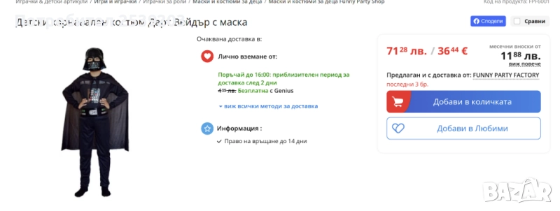 Костюм Дарт Вейдър STAR WARS 9-10 години → Обява 52290986