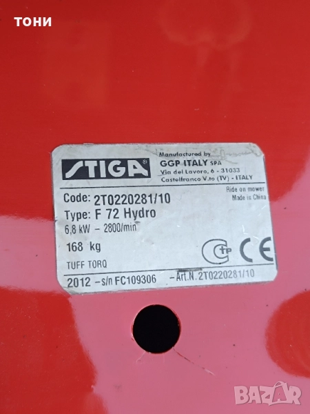Тракторна косачка Castelgarden . Компанията е със седалище Italy и е част от Stiga Group. Двигател Briggs Stratton 17.5hp. Трансмисия-ръчна,6скорости. Задно изхвърляне на окосената трева с кош. 7нива на косене. Цена 3900лв. Телефон/viber 0878393400 /450258/