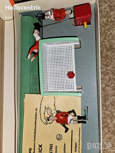 Стара футболна игра от 70те.Кутията включва 6 футболиста,от които 2ма вратари с подвижен механизъм,останалите футболисти "ритат" с единия крак,две футболни врати,2 топки и зелен терен с упътване, само за ценители...