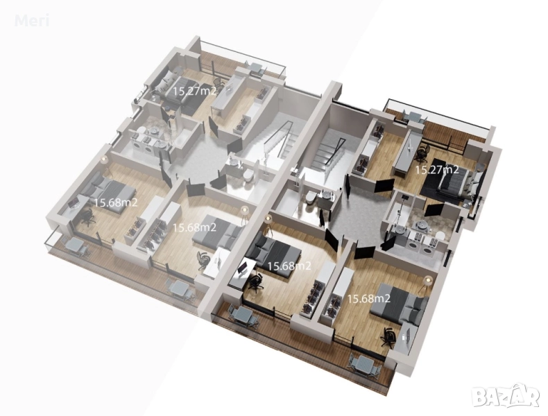 • Голяма покривна тераса ~60 кв.м – с потенциал за лятна кухня, барбекю, джакузи или релакс зона с шезлонги