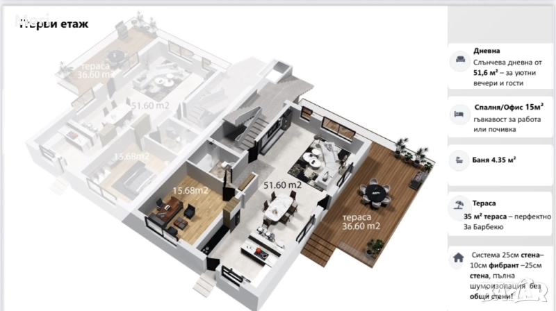 • Просторна тераса на първи етаж: 35 кв.м