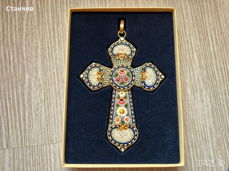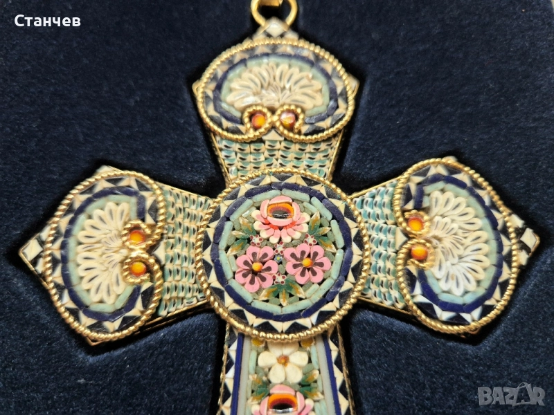 Прекрасен декоративен кръст, изработен от истинска италианска микромозайка (Real Mosaic). Ръчна изработка с фини детайли от цветно стъкло. Произход: Италия. Размер с халката: 15 см. В отлично състояние, без забележки, с оригинална кутия. Подходящ за подарък, колекция или религиозна декорация.