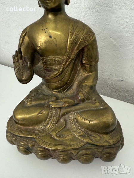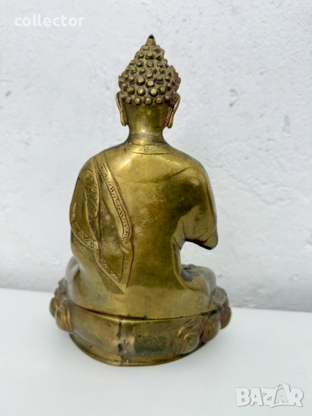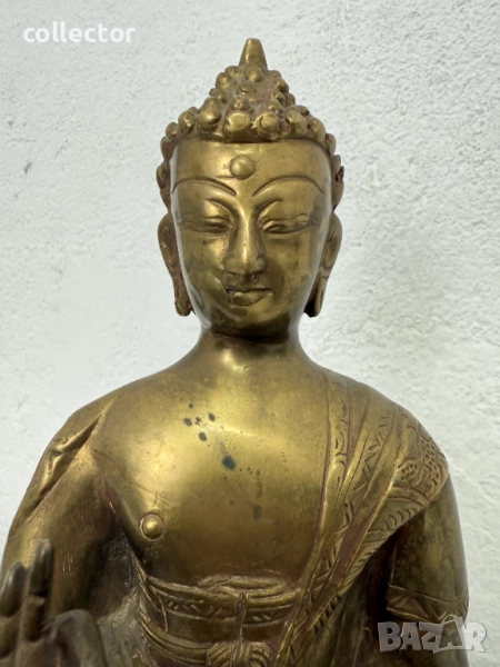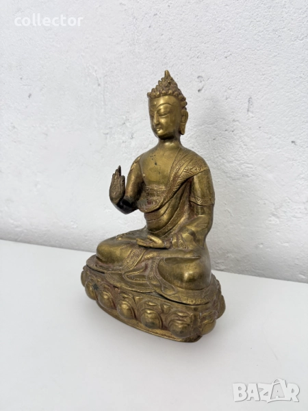 Статуята изобразява Буда в поза на медитация, известна като "Дхяна мудра", където дясната ръка е вдигната с длан напред, което символизира даряване на благословия и премахване на страха.