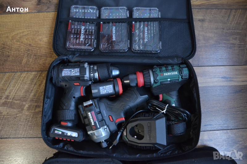 1. Голяма чанта, побира три инструмента с три батерии и зарядно, както и 4 кутии с накрайници, свредла и др. Цена - 23 евро.