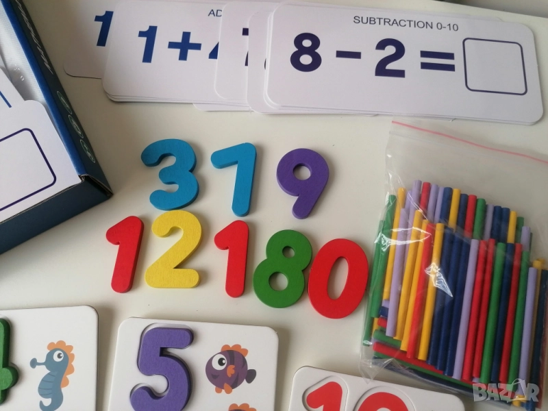 Това е уникално направена игра, с която детето ще учи математика по най-забавния начин! Освен 3D дървените цифри и разноцветните клечки за по-лесно и нагледно броене, играта разполага с карти, на които са нарисувани съответния брой различни животинки и на тях има място да се постави съответната цифра. И още – върху други бели карти са написани лесни задачи по математика – всички варианти за събиране и изваждане на числата от 1 до 10 и празно място, където детето да попълни отговора. В комплекта има и маркер, който лесно се трие. Това е една невероятна игра, която ще запознае и научи детето на основите на математиката по лесен и забавен начин!
