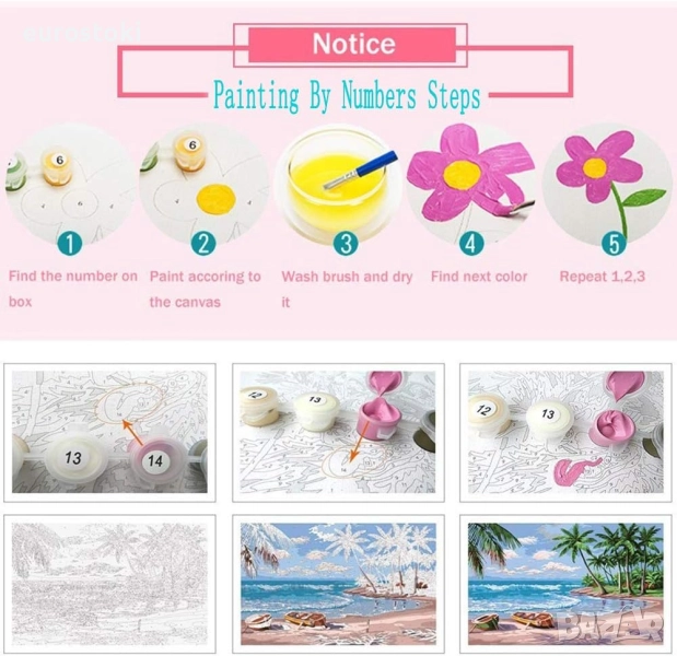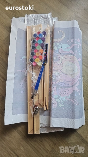 Рамката „Направи си сам“ има предварително отпечатани номера, съответстващи на комплекта бои. Всеки цвят боя е обозначен с номер. Просто следвайте номерата. Комплект за рисуване по номер върху платно 40x50 см.