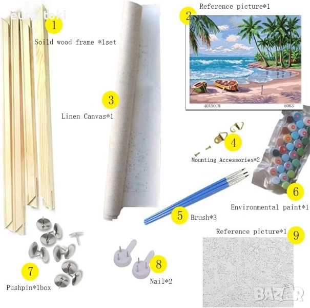 - Комплектът за рисуване по номера включва 1 бр. предварително отпечатано текстурирано платно за рисуване (DIY рамка), 1 комплект акрилни бои, 1 комплект четки (включват 3 бр.).