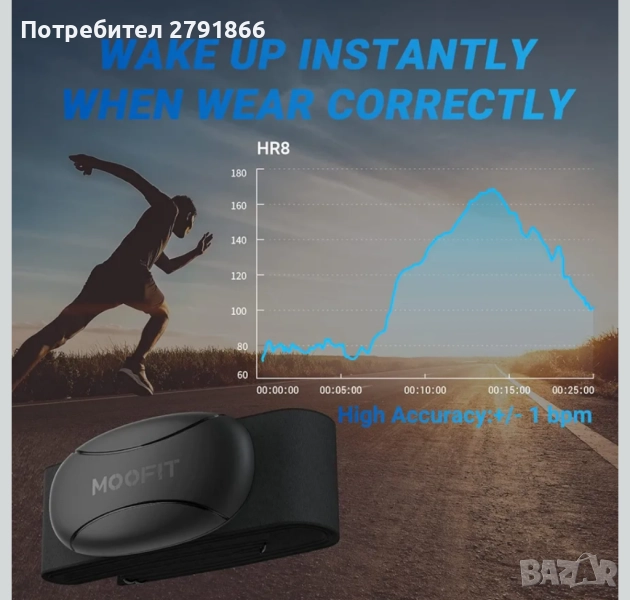 - Kаишкa Moofit - HR8 се предлага с дишаща каишка за гърди, подобрени електроди, лесна за употреба катарама и регулируема дължина от 63,5 см до 132 см. Удобни и без смущения, остават на място, когато сте в движение.