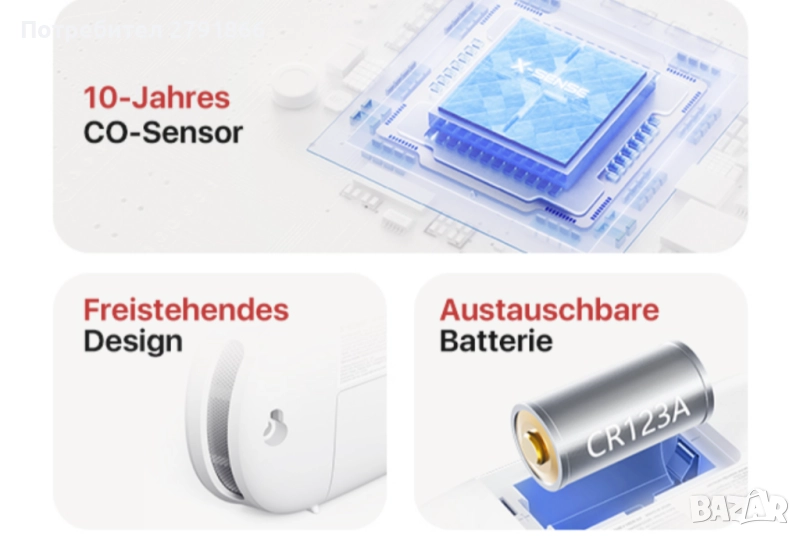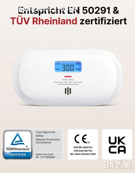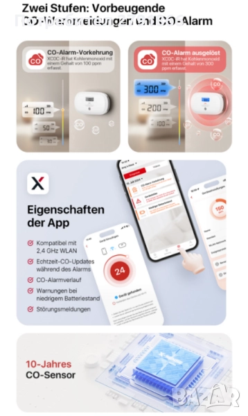 - 10 ГОДИНИ ЖИВОТЕН ПРОДЪЛЖИТЕЛ Този детектор за CO има издръжлив електрохимичен сензор, който работи надеждно в продължение на 10 години, осигурявайки дългосрочна безопасност.