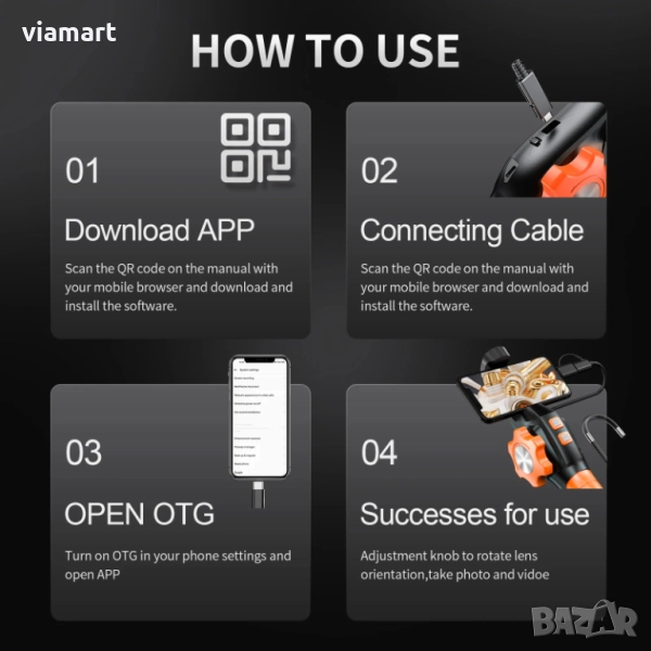 Ендоскопска камера GUANMOU ZX31-01, предназначена за диагностика и оглед на труднодостъпни места. Подходяща е за автомобилна поддръжка, ВиК и електроинсталации, както и за домашни ремонти. Камерата разполага с въртящ се на 360° връх, Full HD обектив с диаметър 6.4 мм и 6-степенно LED осветяване за ясна видимост дори в тъмни пространства. Съвместима е както с Android, така и с iPhone, като се свързва директно към телефона и използва неговия екран за преглед в реално време. Чрез инсталиране на приложение може да записва снимки и видео директно на мобилното устройство.