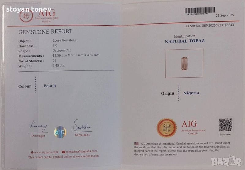 Естествен топаз с деликатен цвят 4.45кт.! Сертифициран! Нов!