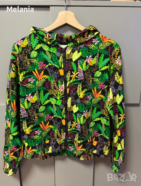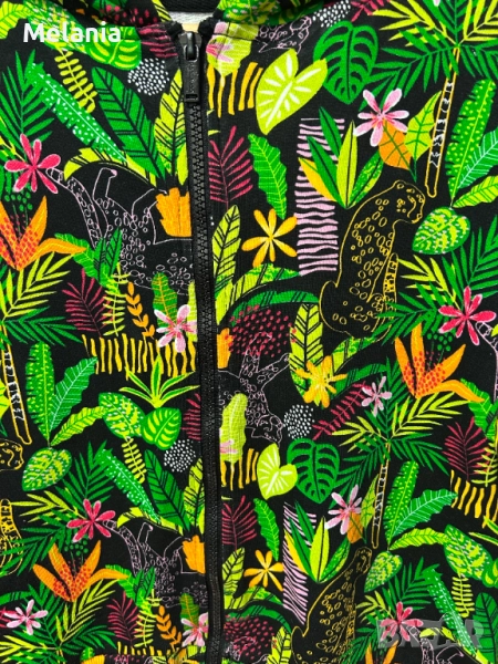 – Цветен суичър с цип с тропически десен – зелени листа, цветя и животни на черен фон.