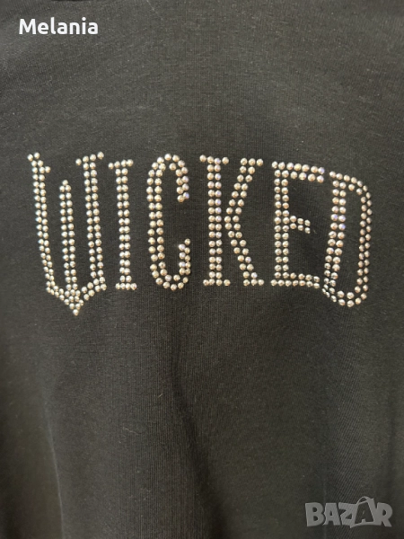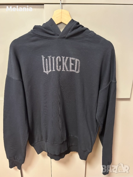 – Черен суичър с качулка и надпис WICKED, изписан с малки камъчета – стилен и ефектен.