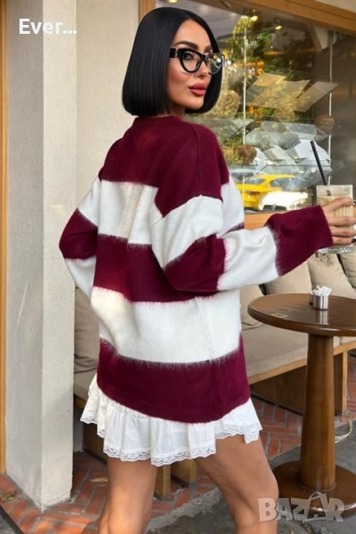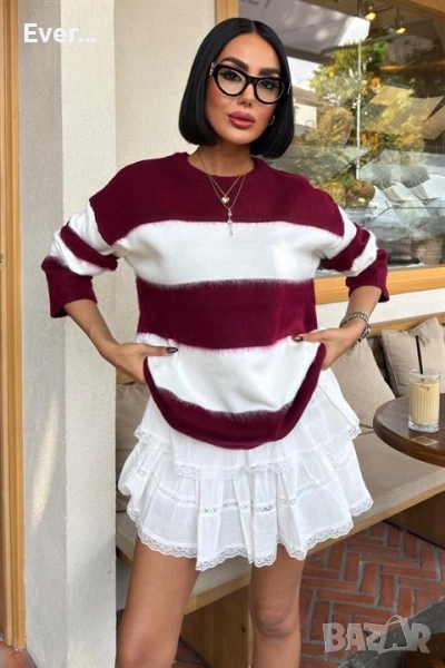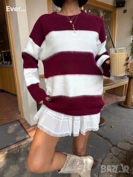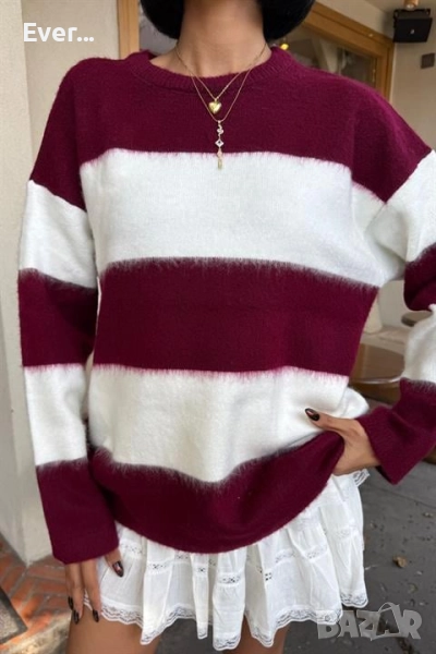 Пуловер в бяло и бордо овърсайз → Обява 52300856